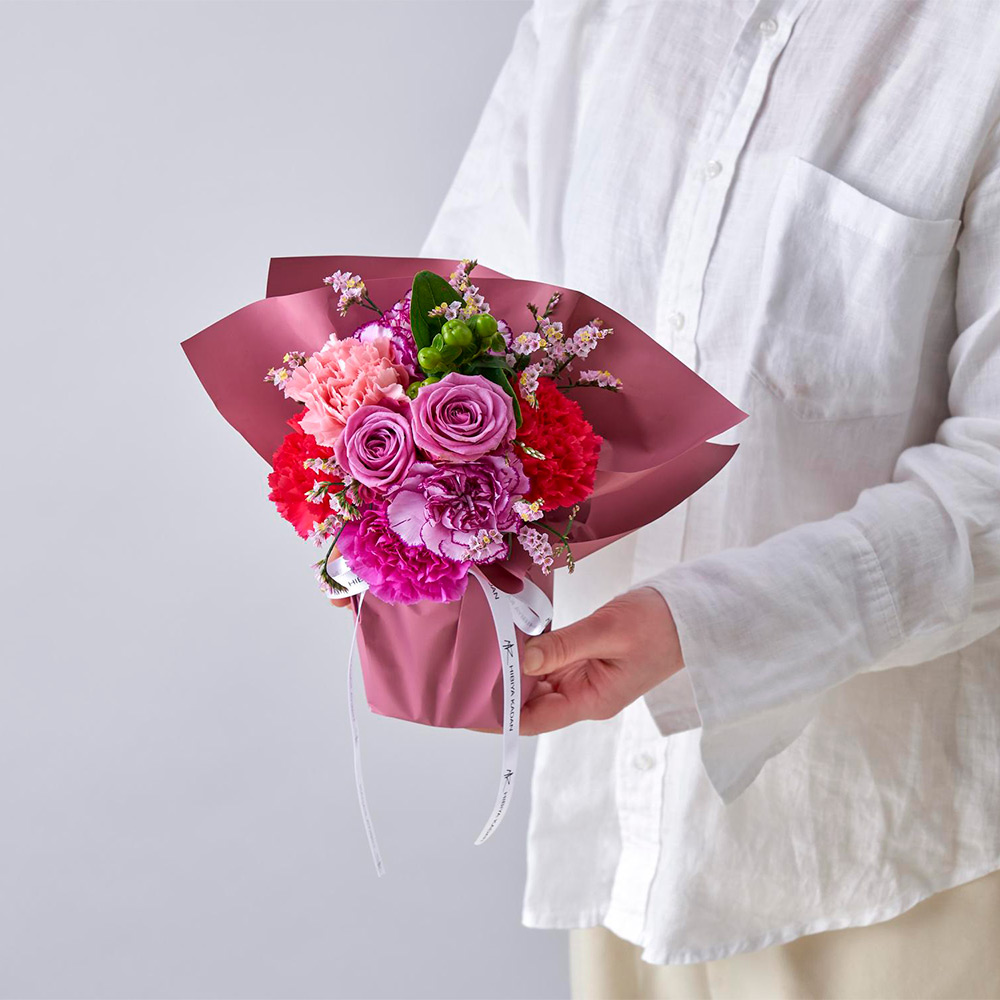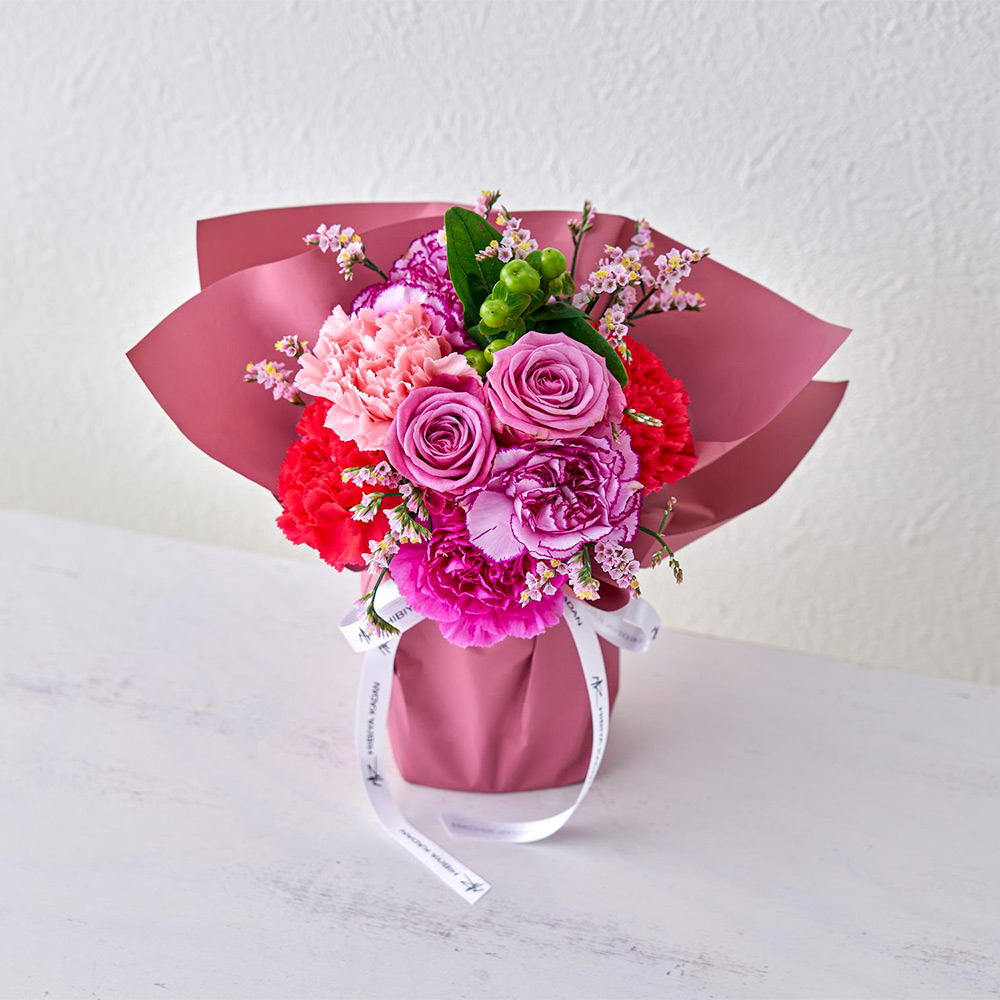 生花:バラ、カーネーション、スターチス、ヒペリカム、グリーン