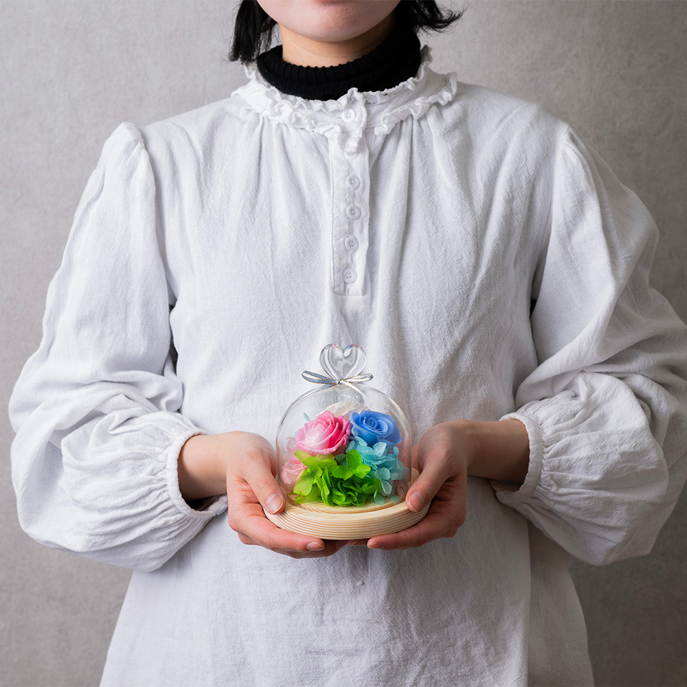 <プリザーブドフラワーとは>プリザーブド(preserved)とは保存の意味、生花の水分を抜き取り特殊な保存液に置き換える特殊加工で、咲いた状態のお花を長時間保ったものです。見た目はみずみずしいのに枯れることのない花。水やりの必要はございません。高温多湿を避けてお楽しみください。