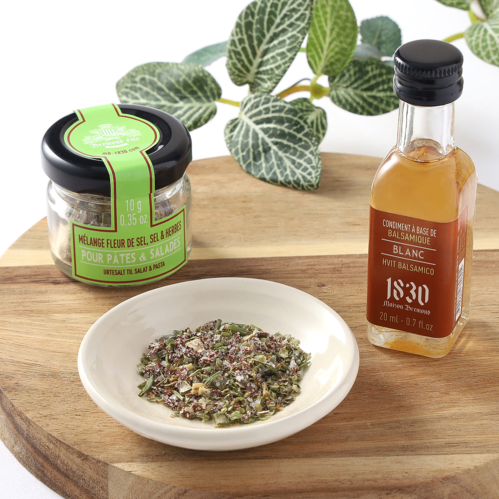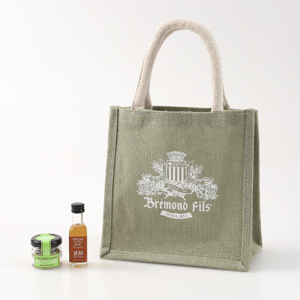 メゾンブレモンド1830ミニジュートバッグ・ミニ調味料セット×1(紋章入りミニジュートバッグ(Sオリーブ)×1 ミニホワイトバルサミコビネガー20ml×1 ミニカマルグソルト パスタ・サラダ用10g×1)