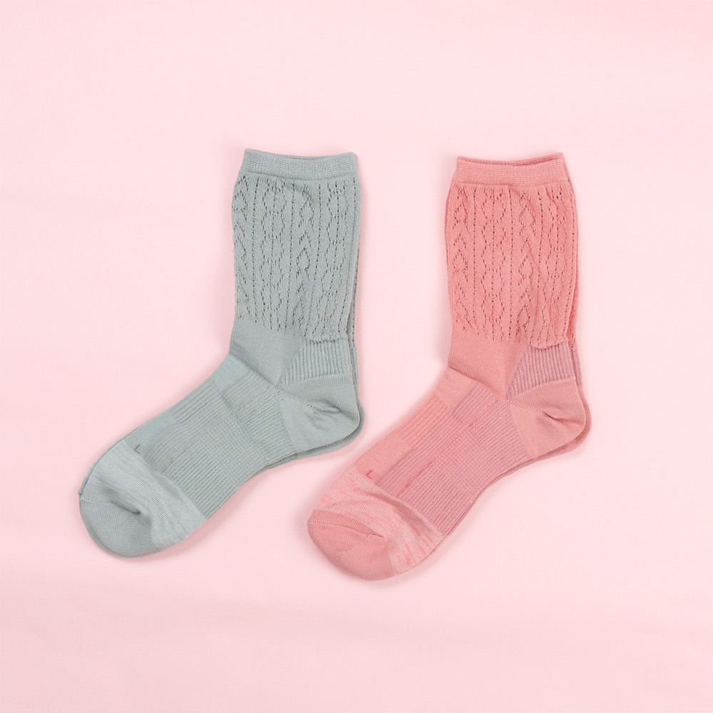 足首クロシェ編みで涼やかに。土踏まずには特許技術のクッション編みをやや薄く設計し、暑い季節も快適。かかとテーピングと母指球滑り止めで、長時間歩いても安心の履き心地です。