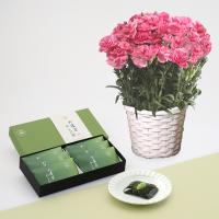 抹茶の風味や色合いを生かしながら、じっくり練り上げたわらび餅と、「母の日」定番のカーネーションの花鉢を組合せ。「母の日」限定の組合せギフトです。