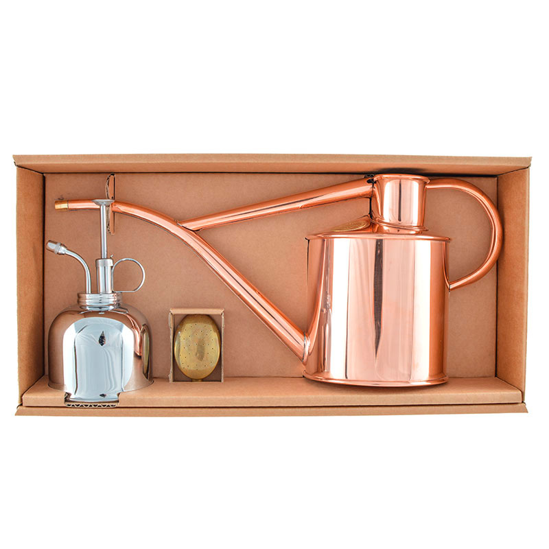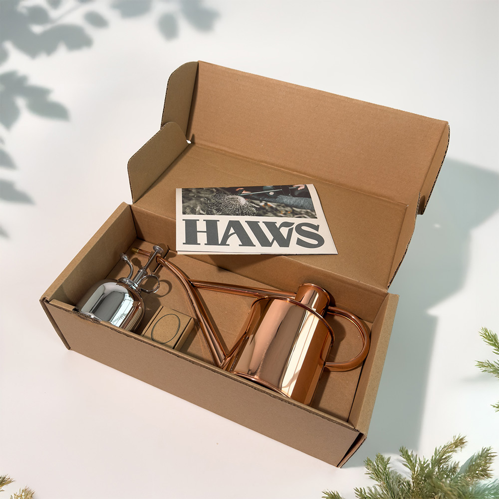 じょうろブランド「HAWS(ホーズ)」の人気シリーズ、銅製ジョウロと、繊細なミストで植物を管理できるミストスプレーのギフトボックスセット