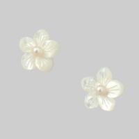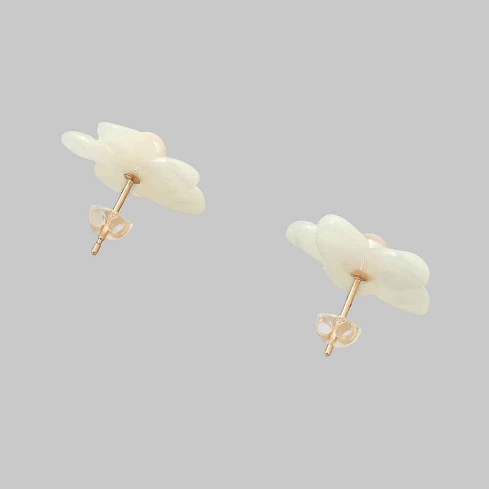 白蝶貝の神秘的な質感を活かしたピアス。美しい光沢を放つ柔和な白が魅力です。白蝶貝を美しい花の形に彫り上げ、ピアスに仕立てました。中央にはアコヤ真珠がセットされて美しい白いきらめきを放ちます。耳元に映えるみごとな大輪のフォルムと、乳白色のコンビネーションが、大人のエレガンスあふれる魅力をアピールします。