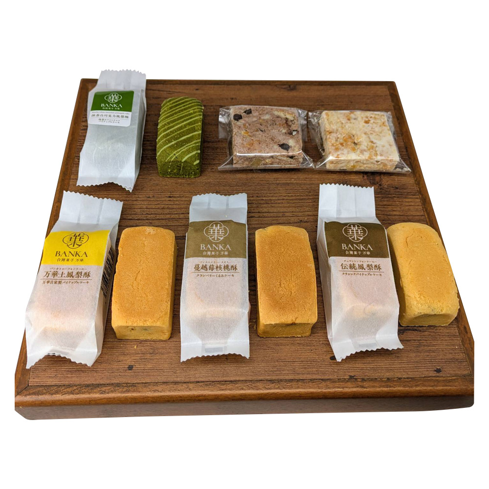 パイナップルケーキ×8(オリジナル・クラシック・クランベリーくるみ・抹茶ホワイトチョコ 各2)、ヌガー×2(プレーン・チョコ 各1)、白桃烏龍茶×1(3g×5包)