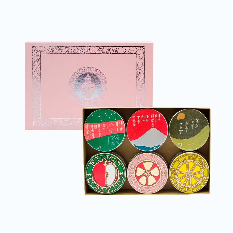 緑茶(福岡県産煎茶30g)×1、緑茶(静岡県産深蒸し煎茶30g)×1、緑茶(京都府産煎茶30g)×1、カラフルの金平糖35g×1、りんごの金平糖35g×1、レモンの金平糖35g×1