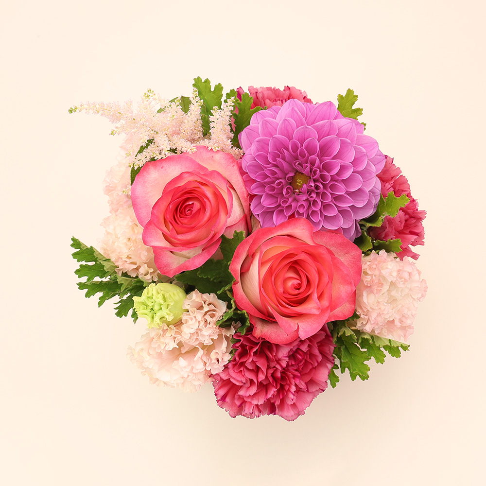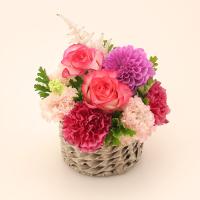バラ、ダリア、カーネーション、トルコキキョウ、アスチルベ等、器:バスケット