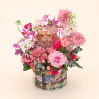 バラ、カーネーション、スカビオサ、モカラ、ラクスパー、ユーカリ等、器:リバティプリントBOX