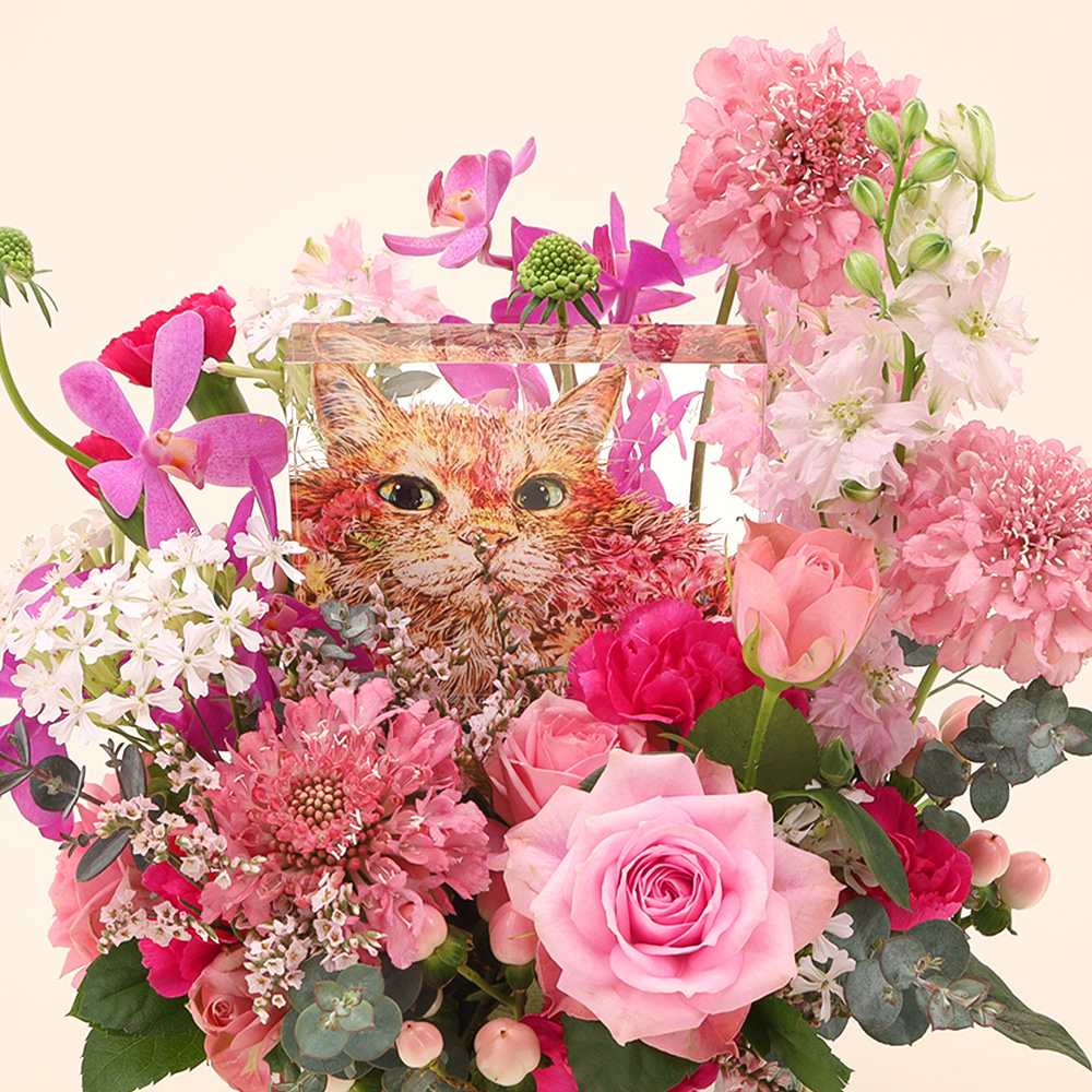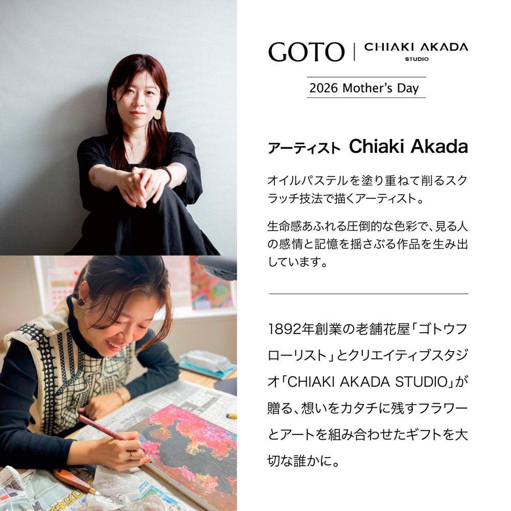 やわらかい眼差しのネコのように、優しく見守ってくれる存在であるお母様への感謝の気持ちをお花に込めた、可愛さ満点の唯一無二のギフトです。アートとフラワーアレンジメントが1つになった新しいギフトプロジェクトART IN BLOOMより、第2弾としての高島屋店限定母の日ギフトです。大切なお母様を想う気持ちを特別なカタチに。生花の魅力は、時間とともに姿を変える「儚い美しさ」。その瞬間に込められた想いを、アートという永く残るカタチに残すことができないか。そんな疑問から始まったこのギフト。花を贈る体験とアートを飾る体験をひとつのカタチに。そんな想いから、老舗の花屋ゴトウフローリストと、アートをベースとしたクリエイティブスタジオCHIAKI AKADA STUDIOによるこのコラボレーションが生まれました。異なる領域が混じり合うことで生まれる新しい価値を通じて、今回は「お母さんを想う気持ち」に寄り添えるような願いを込めました。
