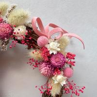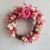 カップ咲きの可愛い茨をメインに、優しい色のドライフラワーでリースに仕上げました。