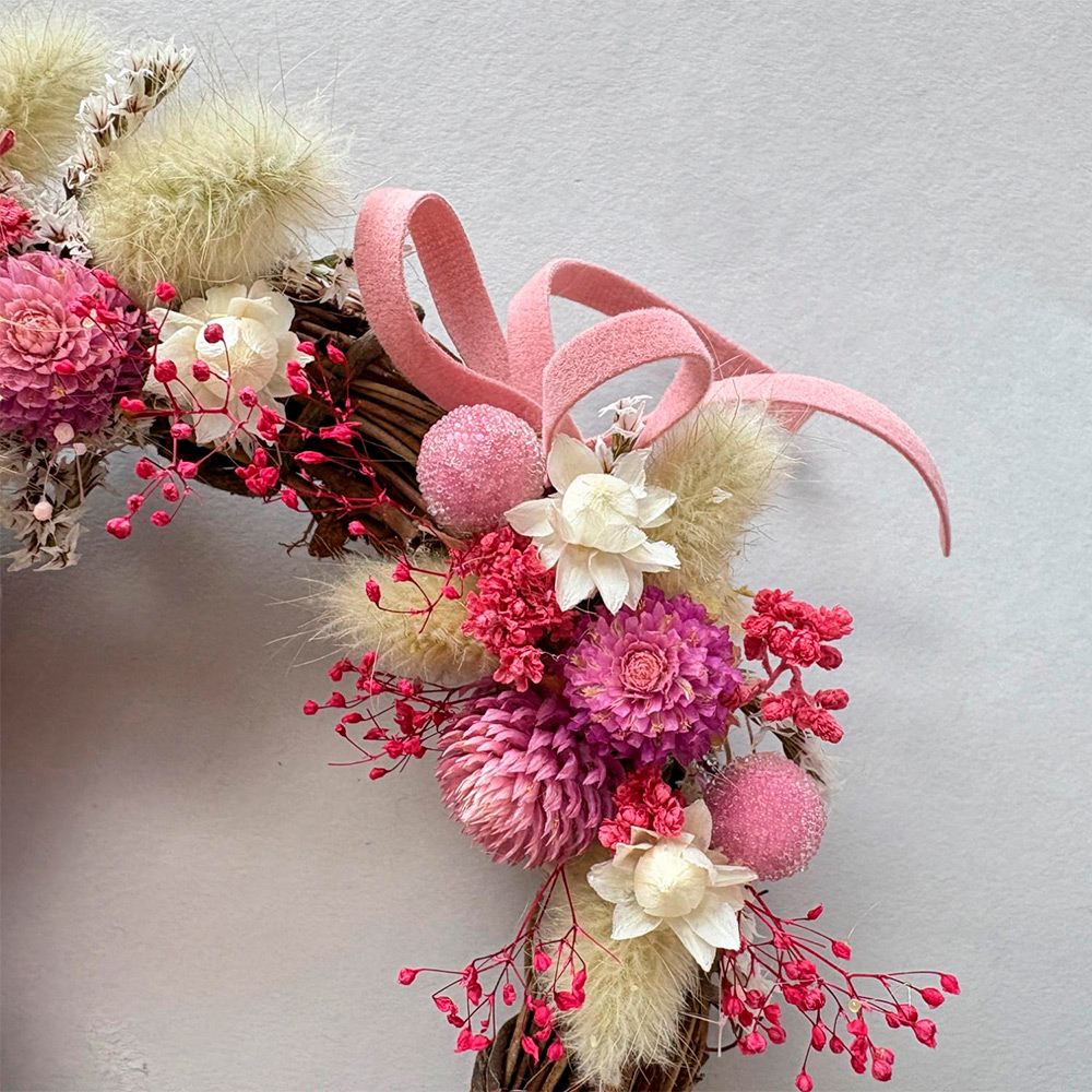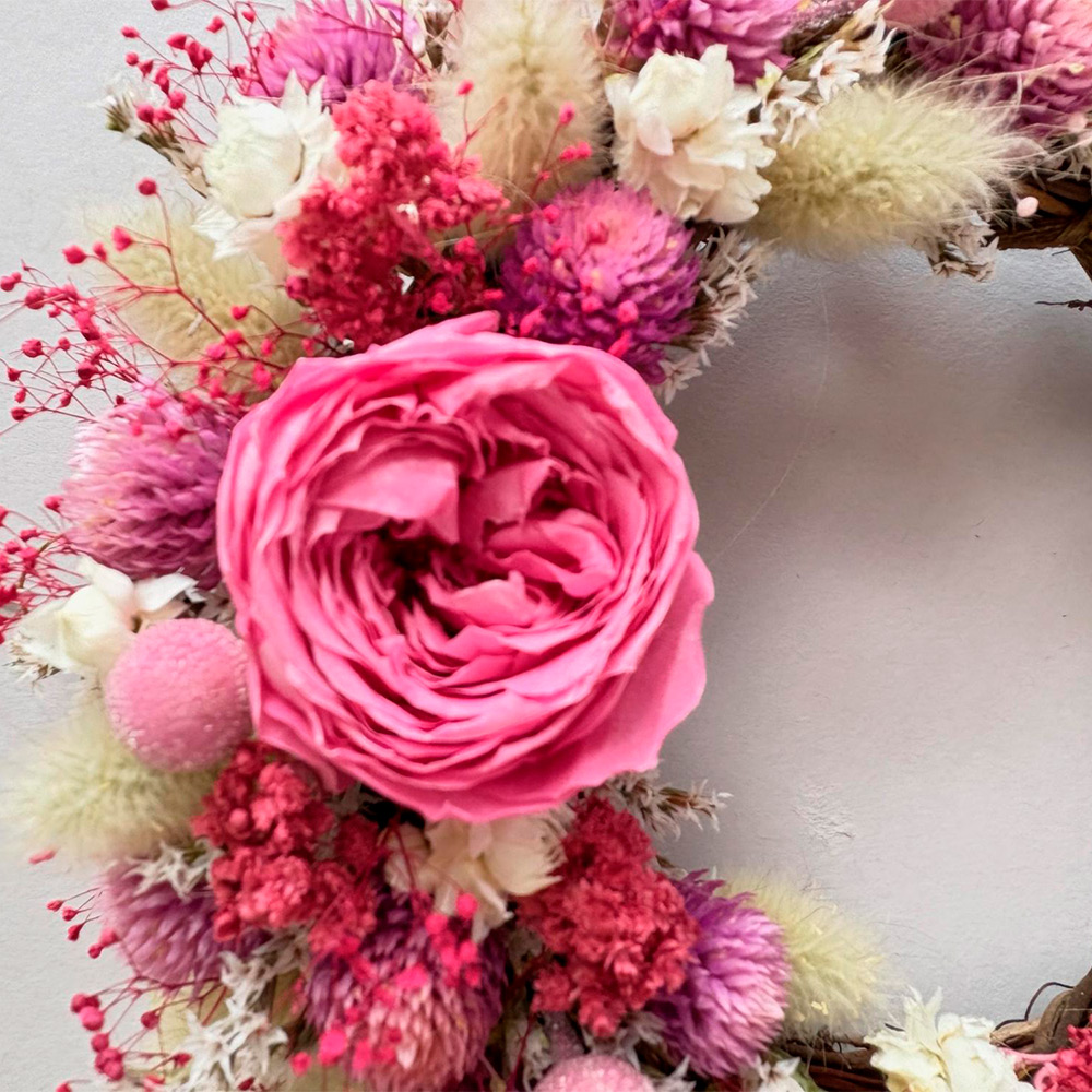 プリザーブドのカップ咲きのバラと、自社で育てた千日紅やアンモビュームなどを使って、ナチュラルテイストのリースに仕上げました。日ごろの感謝の気持ちをリースに込めてお届けいたします。