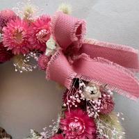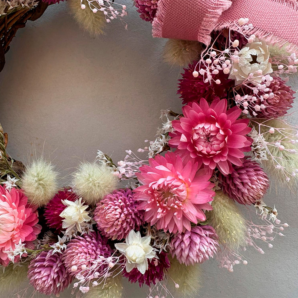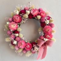 自社農園で育てたヘリクリサムや千日紅を使って、明るいピンクの可愛いリースに仕上げました。日頃の感謝の気持ちをリースに込めてお届けいたします。