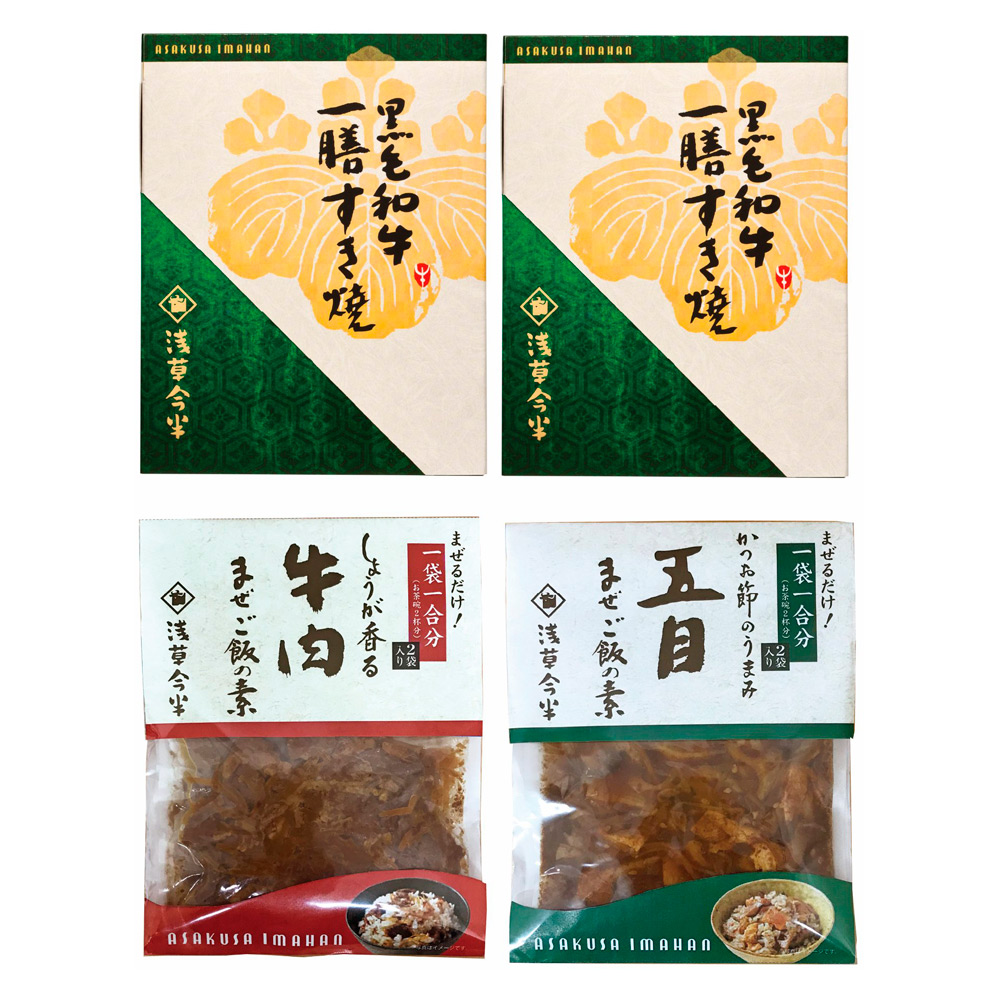 浅草今半流の「すき焼」が食卓で楽しめるレトルトと混ぜご飯の素を詰め合わせました。