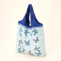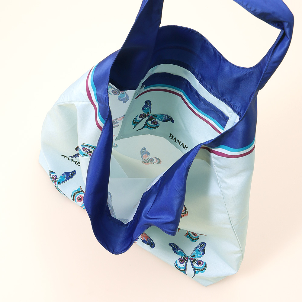 絣織りのようなタッチの特徴的な蝶が舞う森英恵を象徴する蝶のデザイン。自由に飛び交う優雅な蝶の姿が魅力的です。綺麗なラインをデザインに効かせたデザインはスカーフのデザインからインスピレーションを得たエコバッグです。優雅に飛ぶ蝶に日本女性の繊細な美しさを重ねていたとされています。爽やかなライトブルーの地色と濃いめのブルーでメリハリをつけたカラーリングが魅力です。