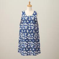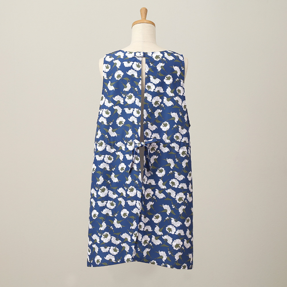 白い爽やかなカーネーションが咲き誇る華やかなデザイン。様々な角度から描かれるカーネーションの花が特徴的なデザインはスカーフのデザインからインスピレーションを得たエプロンです。ブルーの地色と白い花がコントラストをハッキリとさせてくれるカラーリングです。背付きエプロンは腰紐の調節も可能なのでお好みのシルエットでご着用いただけます。