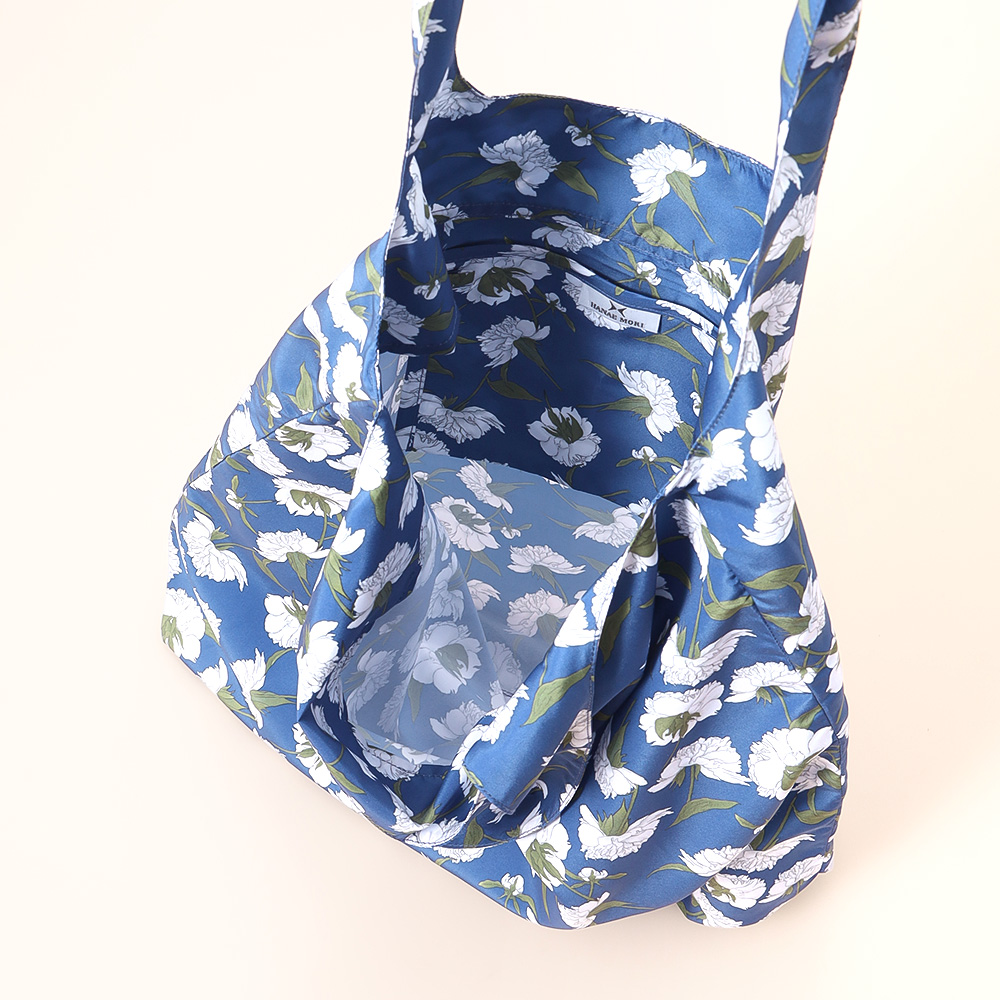 白い爽やかなカーネーションが咲き誇る華やかなデザイン。様々な角度から描かれるカーネーションの花が特徴的なデザインはスカーフのデザインからインスピレーションを得たエコバッグです。ブルーの地色と白い花がコントラストをハッキリとさせてくれるカラーリングです。