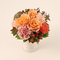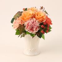 アレンジメント:バラ・カーネーション・ヒペリカム・グリーン、花器:陶製