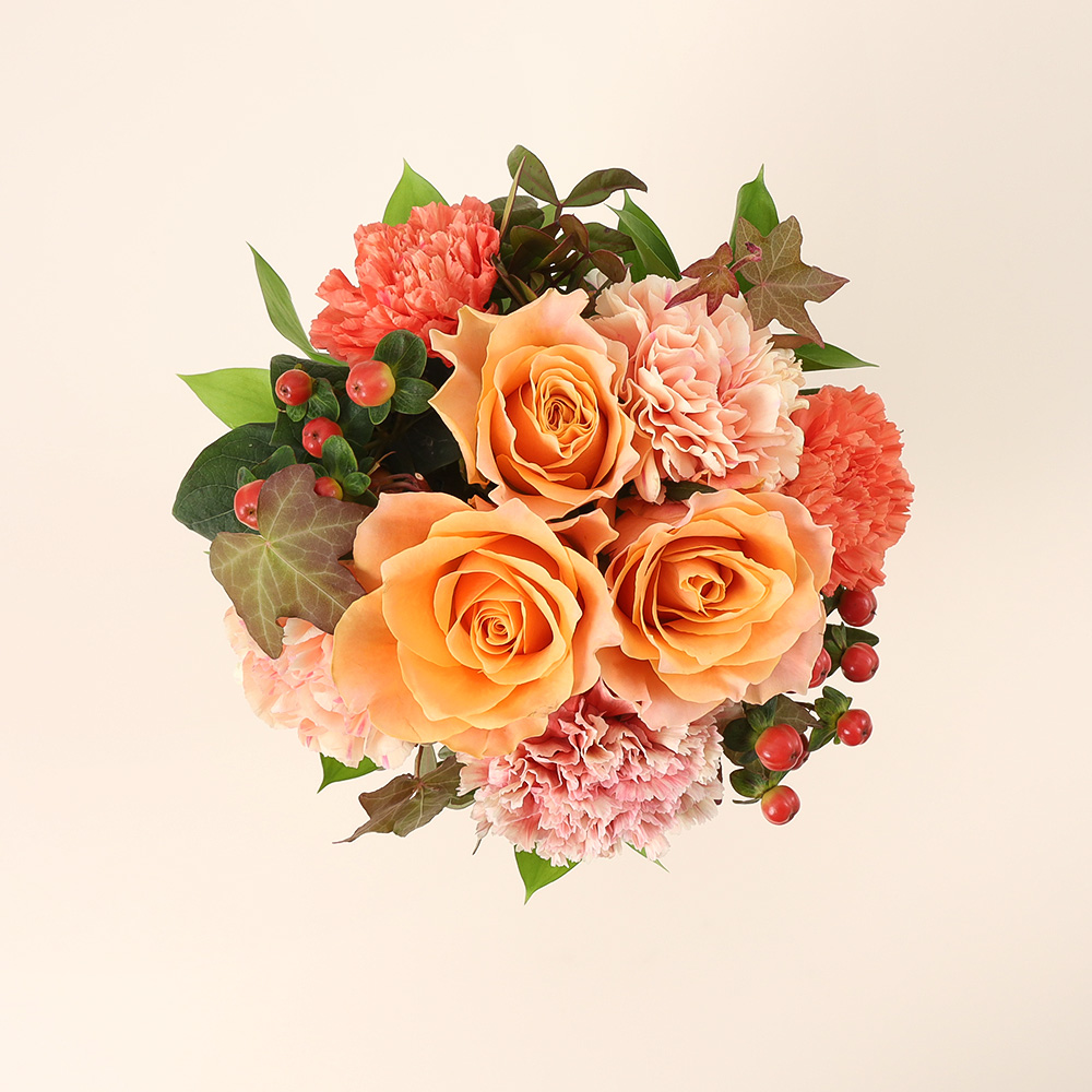 やわらかなアプリコットの彩りにそっと気品を添えて。お洒落なお母様へ贈る洗練のフラワーアレンジ。