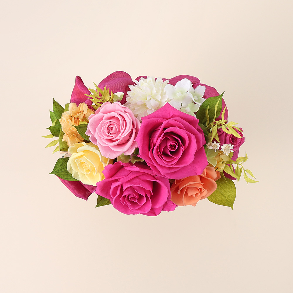 生花ではございませんので、水やりなどのお手入れは必要なく、一定期間の間、変わらずご鑑賞いただけます。※一部造花もございます。また、高温多湿を避けてお飾りください。