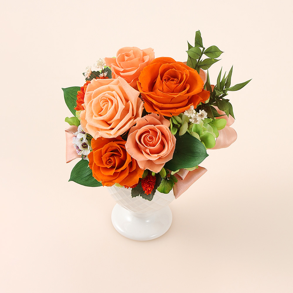 生花ではございませんので、水やりなどのお手入れは必要なく、一定期間の間、変わらずご鑑賞いただけます。※一部造花もございます。また、高温多湿を避けてお飾りください。