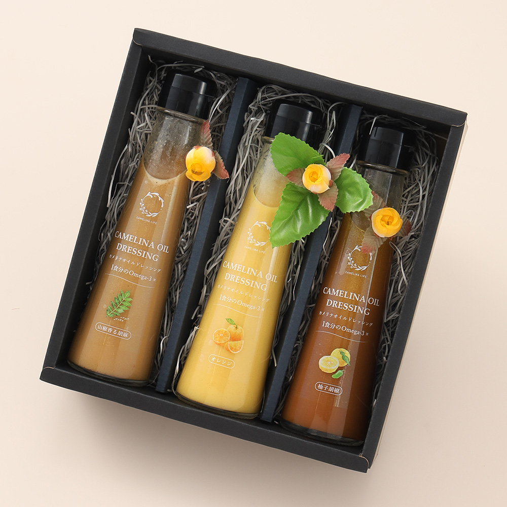 大切な方へ、毎日の健康とおいしさを贈りませんか。国産こだわりのオメガ3豊富な希少な良質油“国産カメリナオイル”を使用した、ドレッシング3種のギフト。1食分のオメガ3が手軽に摂れるヘルシーなドレッシングです。香り、味わい、装いまで華やかに。