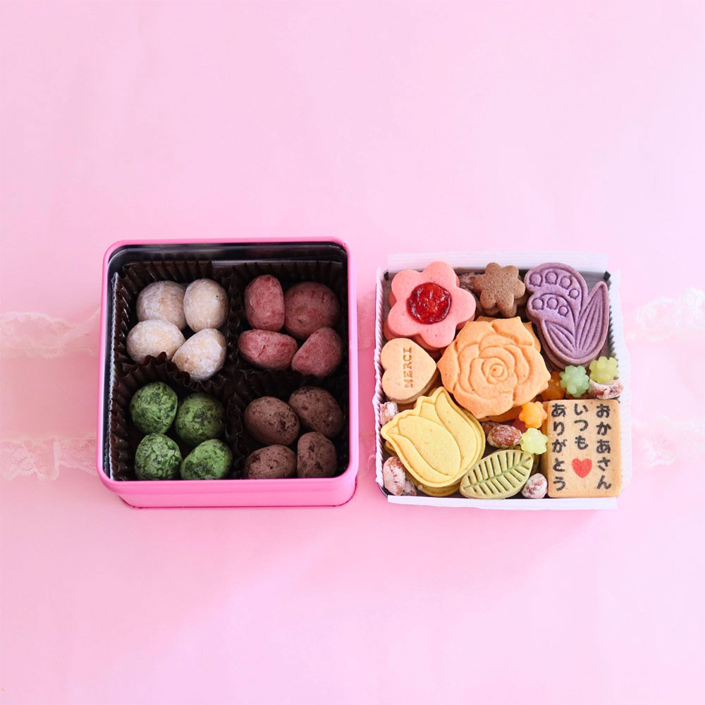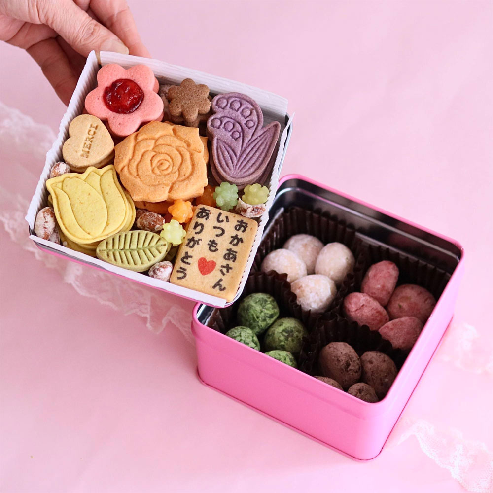 缶の蓋を開けると目に飛び込んでくるのは色とりどりの花々をかたどった愛らしいクッキーたち。寄り添うように添えられたカラフルな金平糖がお母さんへの感謝の気持ちを華やかに彩ります。贅沢な二段式の仕掛けで、上段のクッキーを楽しんだあとは、口の中でほろりとほどけるポルボロンが下段にたっぷり。プレーン・イチゴ・抹茶・ココアの4種の味わいで、心温まるティータイムを演出します。「食べ終わるまでに3回願い事を唱えると叶う」と言い伝えられる幸せを呼ぶお菓子ポルボロン。お母さんの幸せを願う気持ちを込めて、母の日の特別なひとときをお届けします。