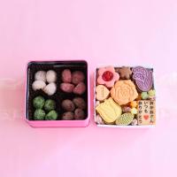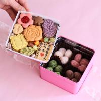 上段:クッキー8種各3枚[バラ(オレンジ)、チューリップ(レモン)、スズラン(カシス)、葉っぱ(ピスタチオ)、小花(ココア)、ハート(プレーン)、プリントクッキー(プレーン)、サブレ・フレーズ]、アマンド・サレ6粒、金平糖6粒 下段:米粉を使ったポルボロン4種各4個(プレーン、イチゴ、抹茶、ココア)