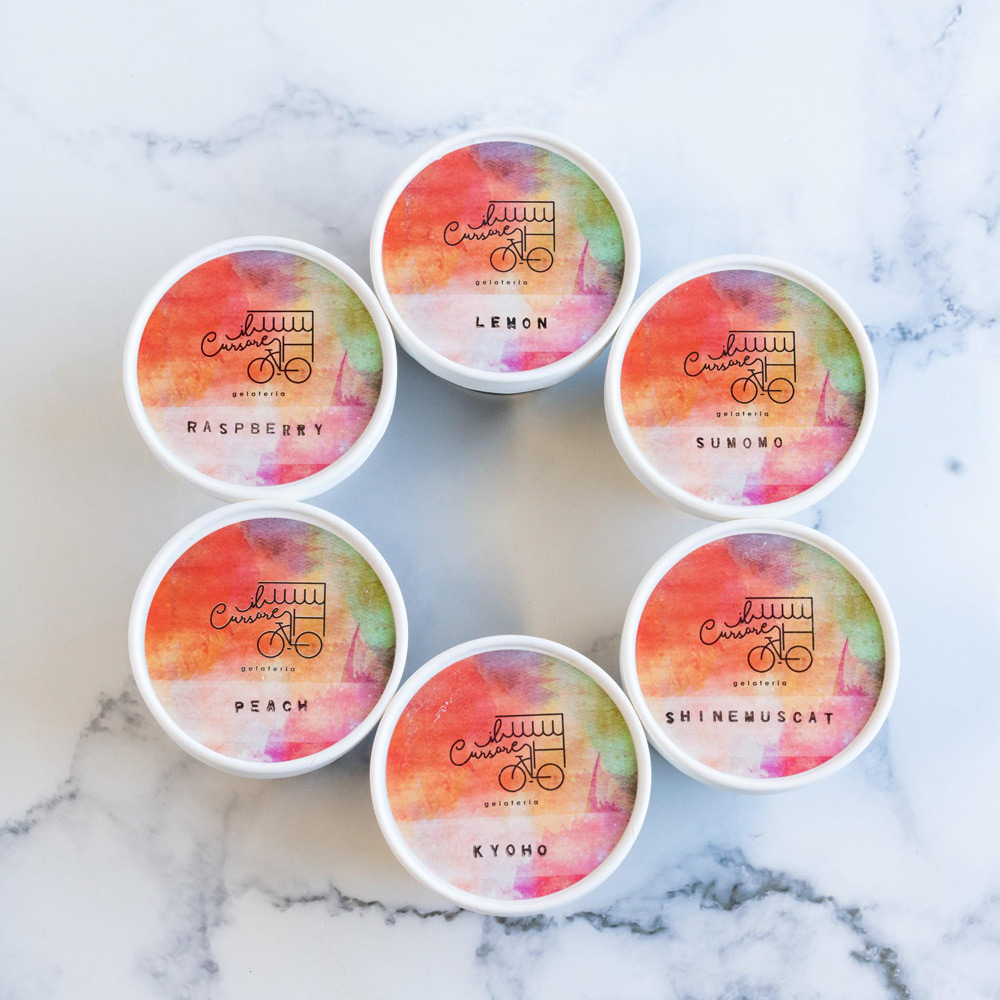 【甲州生ジェラート】 巨峰90ml×1個、シャインマスカット90ml×1個、白桃90ml×1個、すもも90ml×1個、ラズベリー90ml×1個、レモン90ml×1個 合計6個