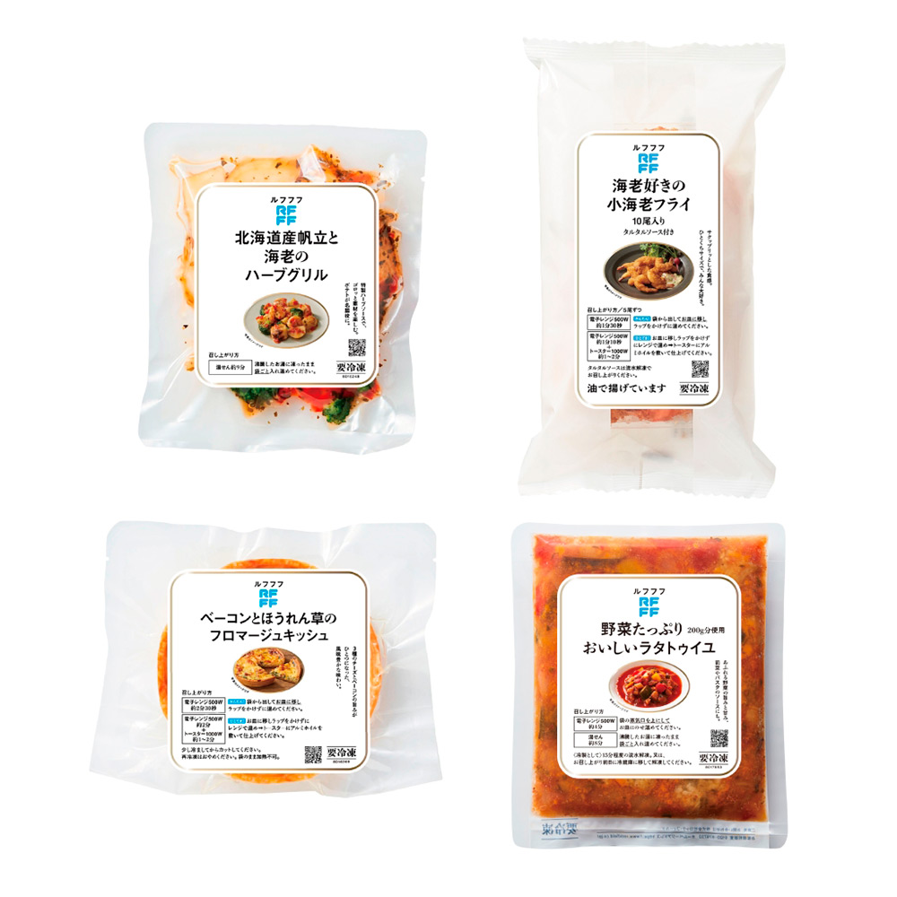 北海道産帆立と海老のハーブグリル150g、海老好きの小海老フライ10尾入りタルタルソース付き180g、ベーコンとほうれん草のフロマージュキッシュ 160g、野菜たっぷりおいしいラタトゥイユ180g
