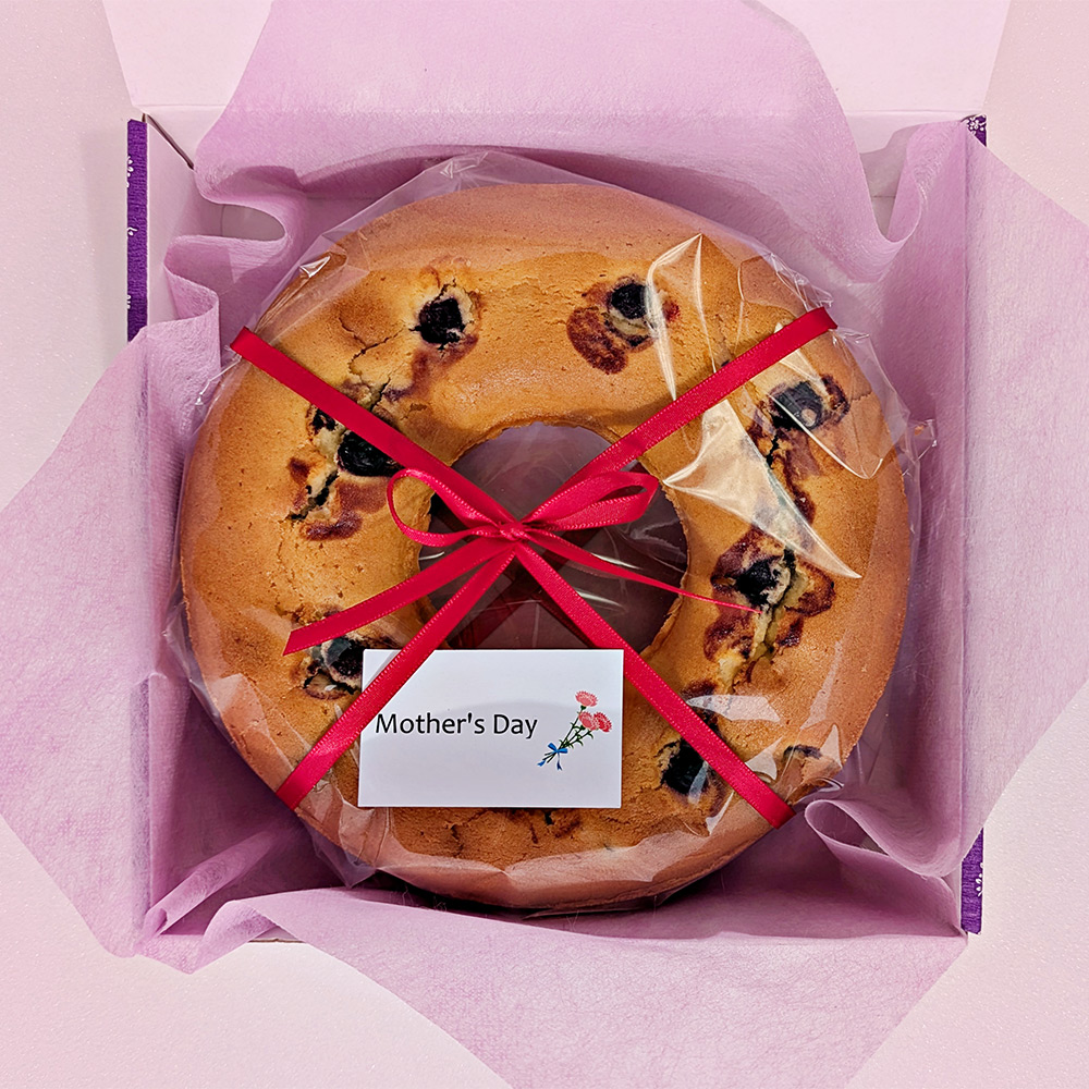 卵とバターの入ったしっとりとした生地に、ブルーベリーをたっぷり入れて焼きあげました。ずっしりしっとりとした甘さ控えめのリングケーキです。母の日の素敵なティータイムに。お召し上がりいただく際に、少し温めると、焼き立てのようなバターの香りと、生地のしっとり感をお楽しみいただけます。母の日限定で、母の日カード付き&リボンラッピングでお届けします。