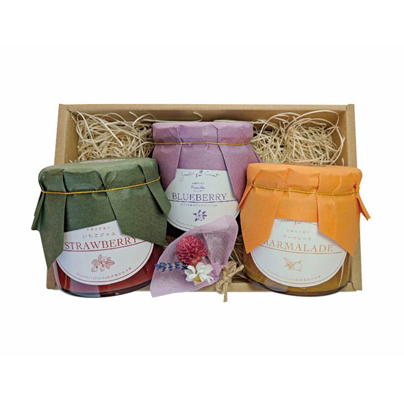 香り豊かな季節の果物を香料、保存料などは一切加えず、ジャム職人の手で丁寧に炊きあげています。つぶつぶとした果肉感、みずみずしい香り。果実の美味しさをそのまま詰め込んだジャムです。季節のジャムを含めた人気のジャムの3本セットに、小さな可愛らしいドライフラワーのブーケと母の日カードを添えてお届けします。1:『ブルベリージャム「ファミリア」』は、ブルーベリーフィールズ紀伊國屋伝統の味。シンプルにブルーベリーとオーガニックシュガーで炊きあげたジャムは自然のおいしさをそのまま凝縮しています。摘みたてのみずみずしさと、たくさんのブルーベリーの果実感を楽しんでいただけるジャムです。2:『いちごジャム』は、契約農家さんが丹精込めて栽培された美味しいいちごをを使用。食べるごとに、いちごの果肉感、コクのある甘酸っぱさが口いっぱいに広がります。3:『甘夏マーマレード』は、甘夏の爽やかな酸味やほのかなホロ苦さ、そしてフレッシュな香りを楽しんでいただけるジャムです。※ドライフラワーは内容が写真と異なる場合がございます。
