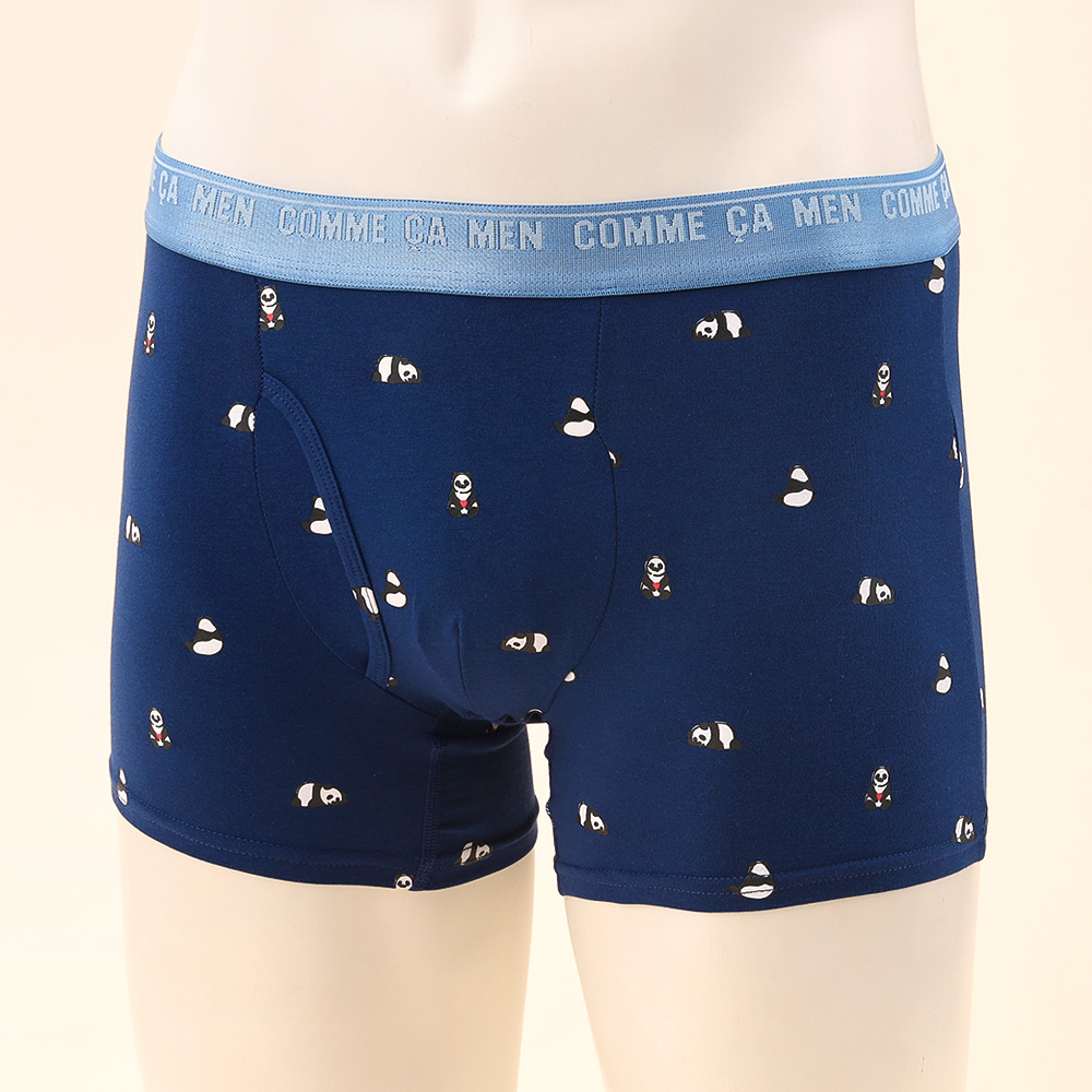 パンダの総柄が愛らしいボクサーパンツ。レギュラー丈、ウエストゴムは肌触りの良い裏パイル仕様、前開きタイプ。