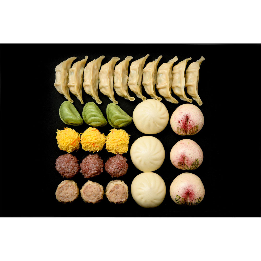 肉焼売35g×3、紫もち米焼売30g×3、海鮮団子30g×3、翡翠蒸し餃子22g×3、ミニ肉まんじゅう40g×3、ミニ桃まんじゅう40g×3、ハーブ豚餃子22g×10