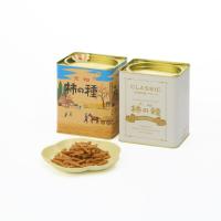 [元祖柿の種CLASSIC170g缶入り]原料は新潟県産水稲もち米100%を使用し、豊かな米の風味が楽しめます。直火焼き製法で香ばしさも味わえます。当時の金型レプリカからサイズを想定して食べ応えのある大きさを再現しました。[元祖柿の種170g缶入り]国産もち米使用。伝統の味とデザインの元祖柿の種。懐かしい大袋詰め化粧缶。