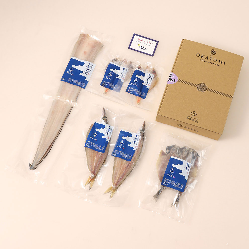島根県沖「一日漁」で漁獲された魚を、買付から製造まで自社一貫体制で行うことで、原料の状態によって漬け込みや乾燥時間を調整し、品質を一定に保っています。加えるのは、塩だけ。魚種に合わせて塩を使い分けたこだわりの一夜干しです。父の日の掛け紙とメッセージカードをお付けしてお届けいたします。
