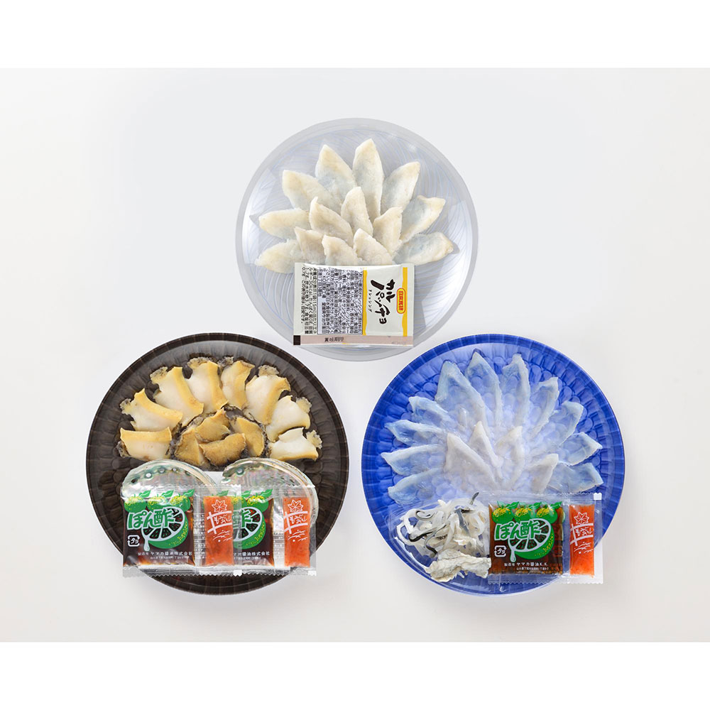 とらふく刺身20g、とらふく皮湯引き10g、とらふく用ぽん酢・もみじおろし×1、あわび刺身23g、あわび刺身用ぽん酢・もみじおろし×2、まふくカルパッチョ30g、まふくカルパッチョ用ドレッシング15ml