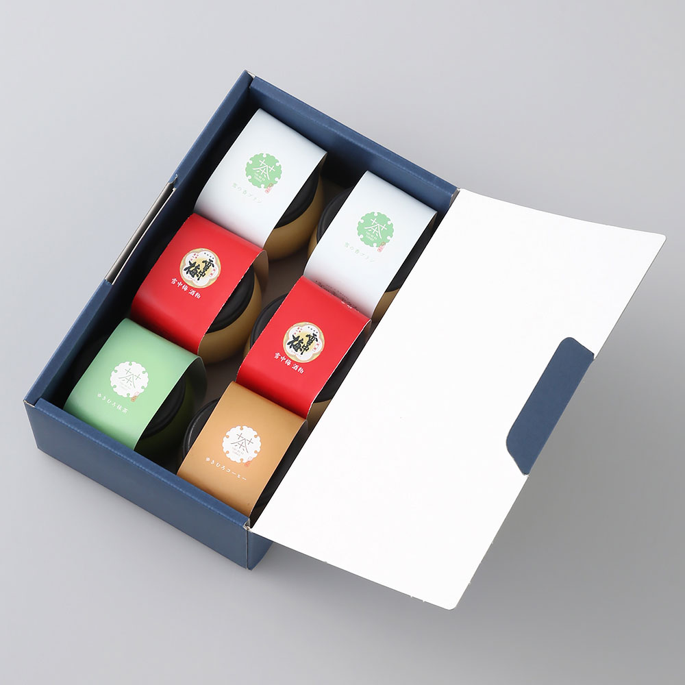 たまごプリン×2、酒粕プリン×2、雪室抹茶プリン・雪室珈琲プリン×各1