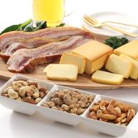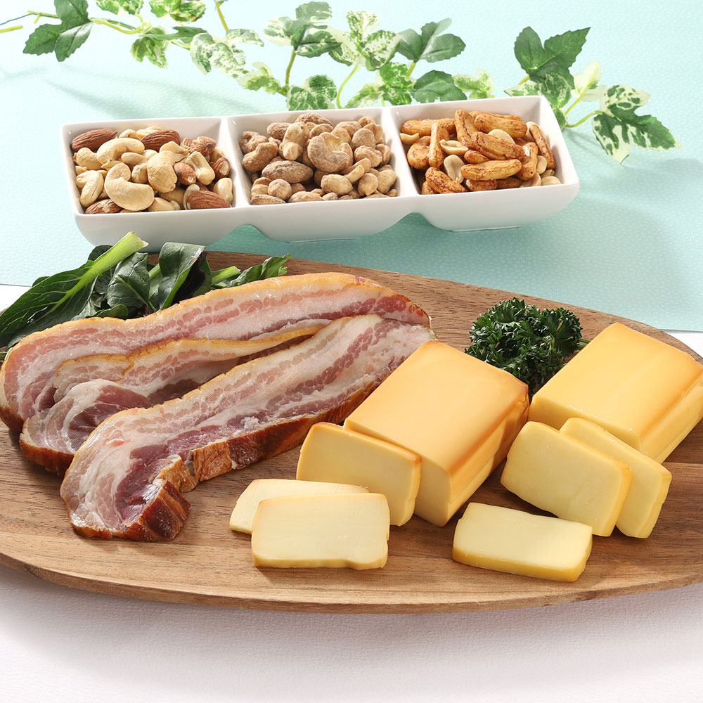 燻製豚肉 200g、燻製ナッツ(軽井沢ブレンド)200g、燻製柿の種 150g、燻製キャラメルナッツ 80g、燻製チーズ(ウイスキーオークブレンド)185g、燻製チーズ(オリジナルブレンド)185g、 化粧箱入り