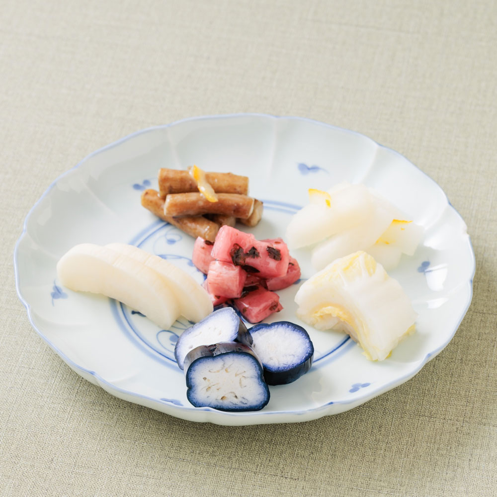 <京のあっさり漬>大根1/4割、<京のあっさり漬>茄子1個、<京のあっさり漬>白菜223g、梅しそ大根100g、ゆず味噌牛蒡83g、ゆずの香り100g 計6点