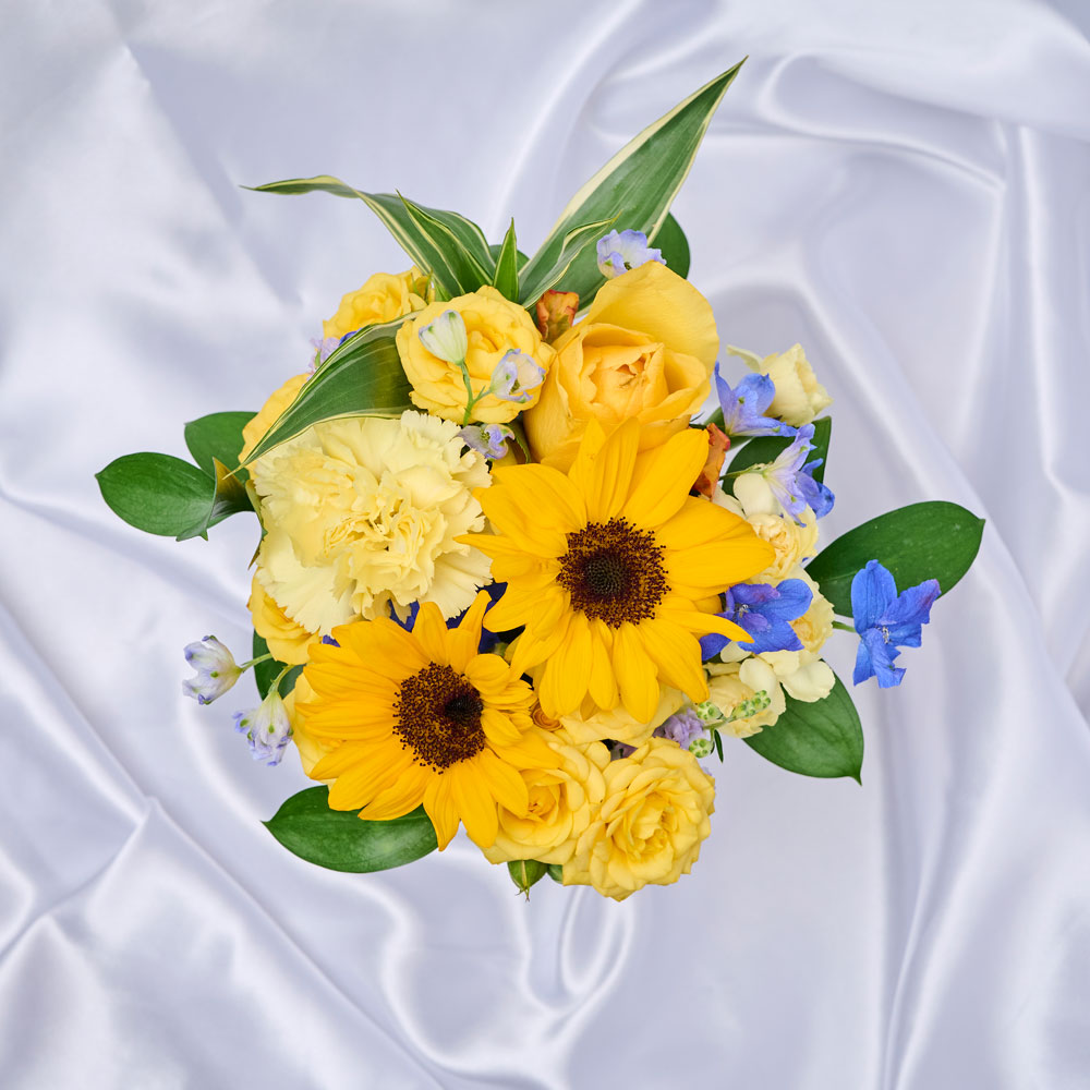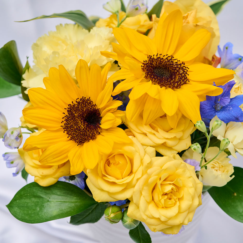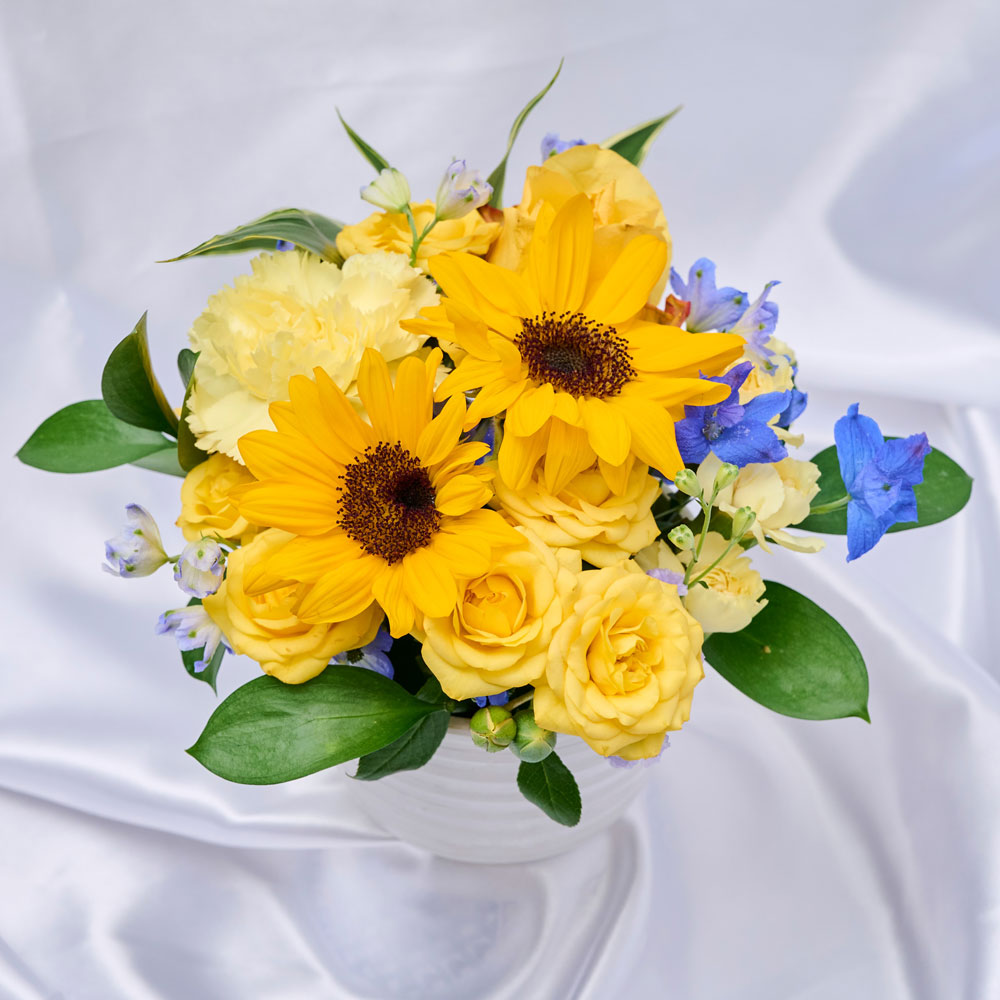 黄色を基調にしたアレンジメント。黄色い花の代表のひまわりを中心に親しみやすい感じに仕上げております。そのまま飾れるアレンジメントなので場所を選ばず、お手入れも簡単です。弁慶堂のあじわいカステラ:シェフパティシエが幼き頃に食べたカステラは、味わい深く、歯触りも適度な重さがあり、素朴で心温まる美味しさでした。そんな記億から、香り、食感、味にこだわった余韻あふれるカステラが仕上がりました。心躍らせる味わいをお届けいたします。