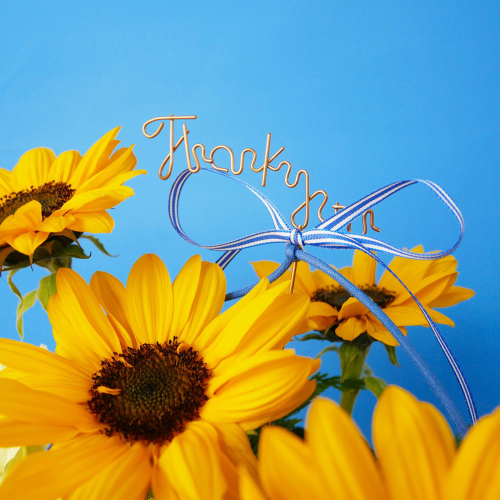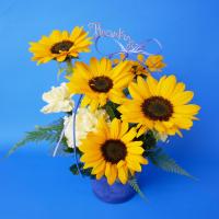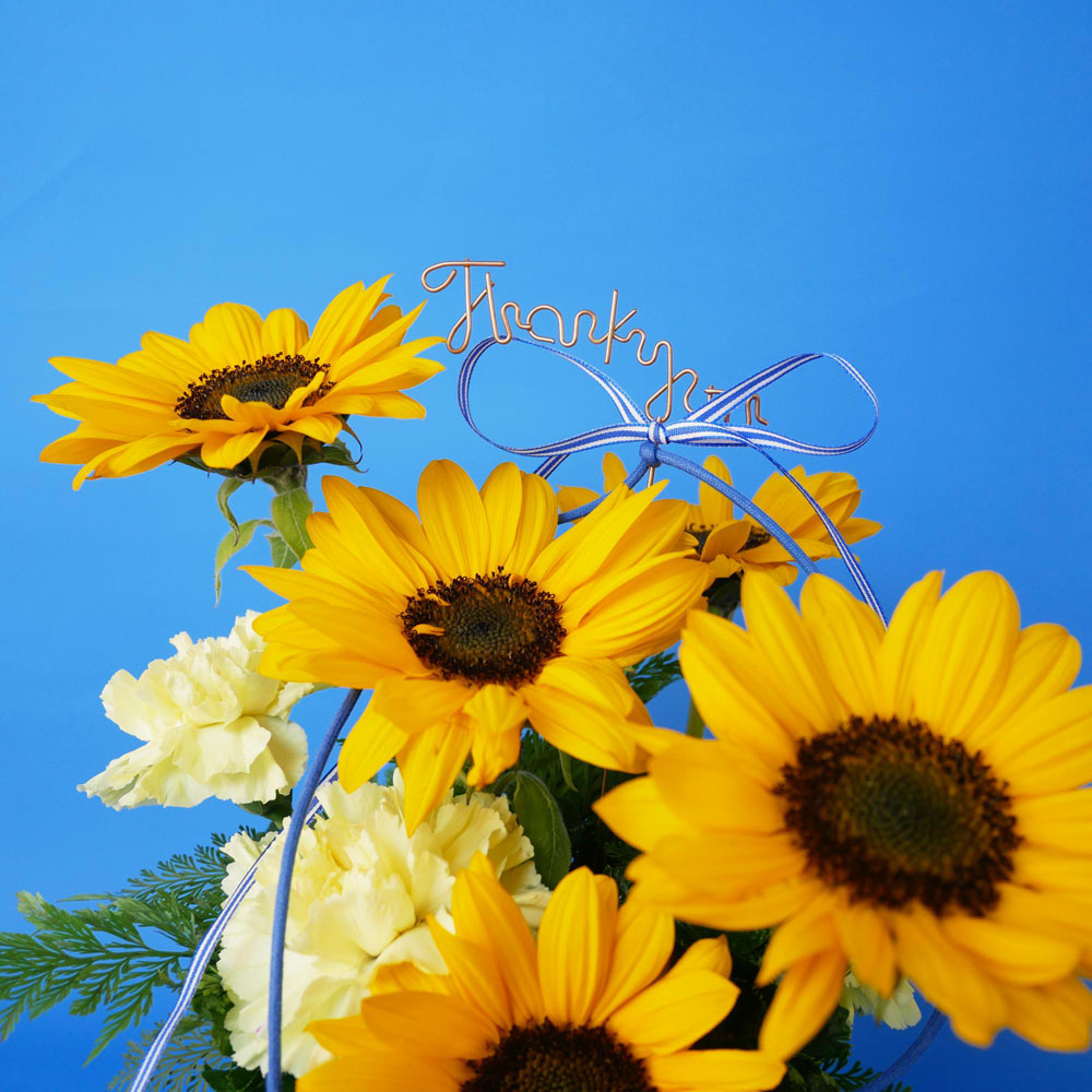 ひまわりを主役に、黄色のカーネーションを合わせた華やかなアレンジメント。ひまわりの花言葉は「憧れ」や「尊敬」。「Thank you」のワイヤーピック付きで、明るい彩りで感謝の気持ちを届ける、父の日の贈りものにぴったりです。ブルーの樹脂製の器は、小物入れや観葉植物の植え替え等に、再利用していただけます。