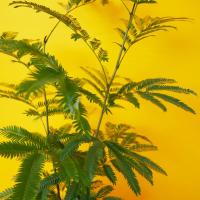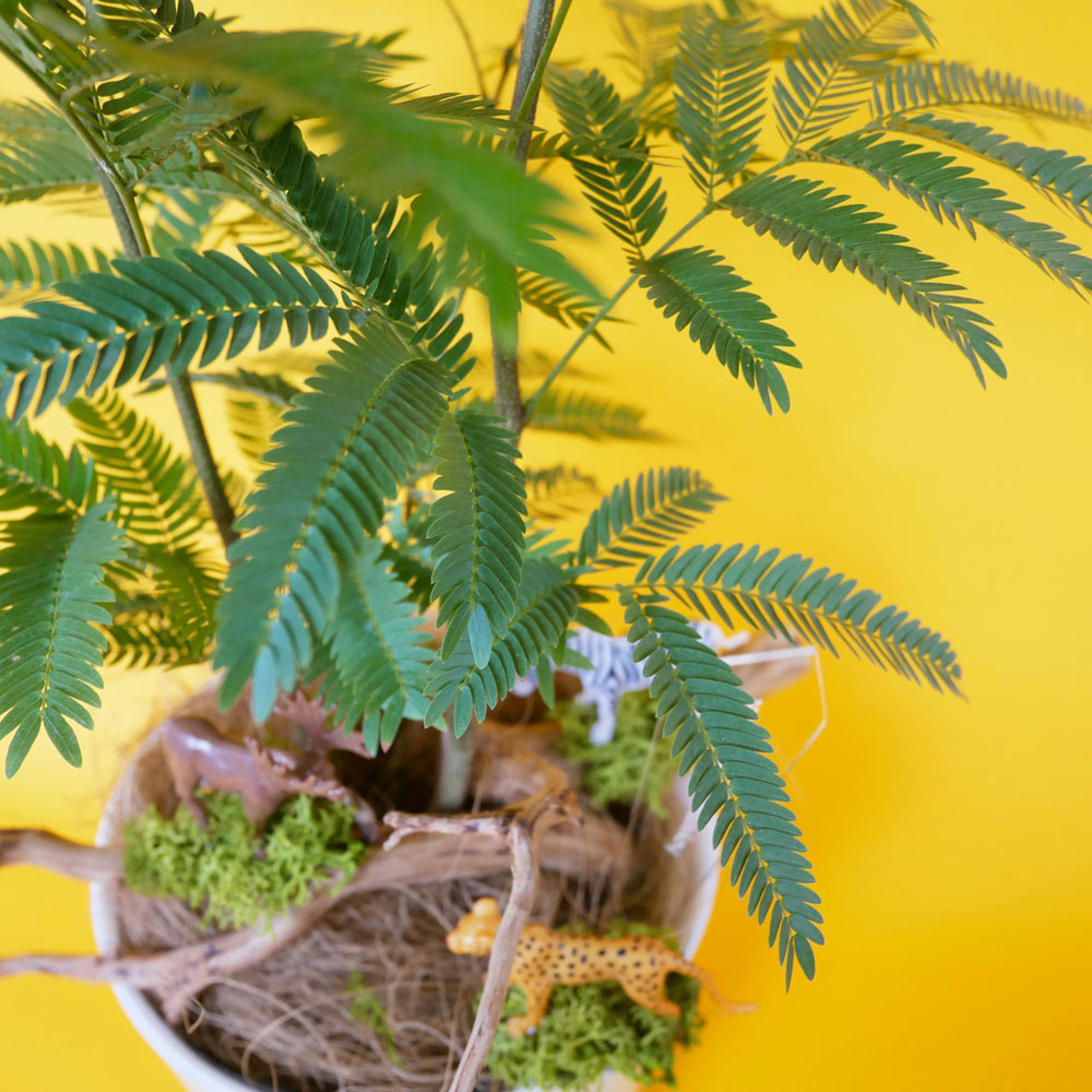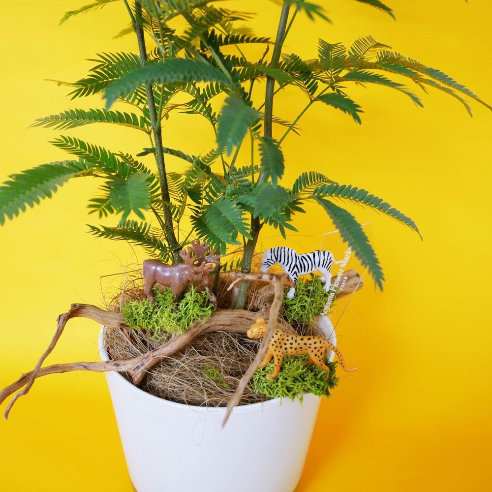 エバーフレッシュは、ブラジルやエクアドル、中南米を主な原産国とするマメ科、コヨバ属の常緑樹です。細く涼しげな葉とスタイリッシュな幹が特徴の常緑高木で、夜になると葉を閉じて眠る「就眠運動」が魅力の観葉植物です。インテリア性が高く、水やりや日当たり管理もしやすいため、贈りものとしても人気があります。動物のオブジェ付きで、お好きな所に飾ってお楽しみいただけます。