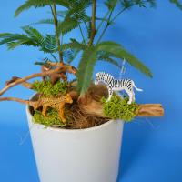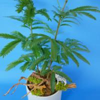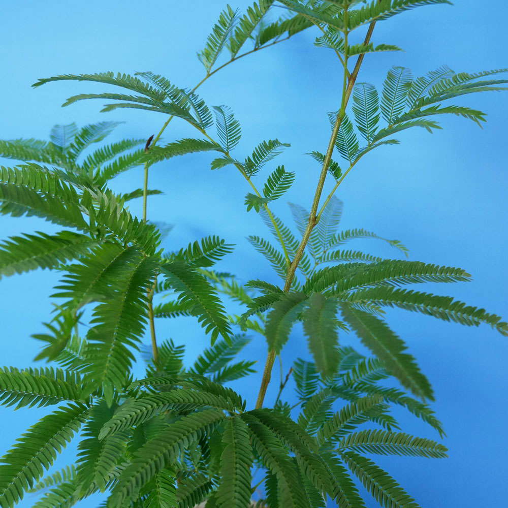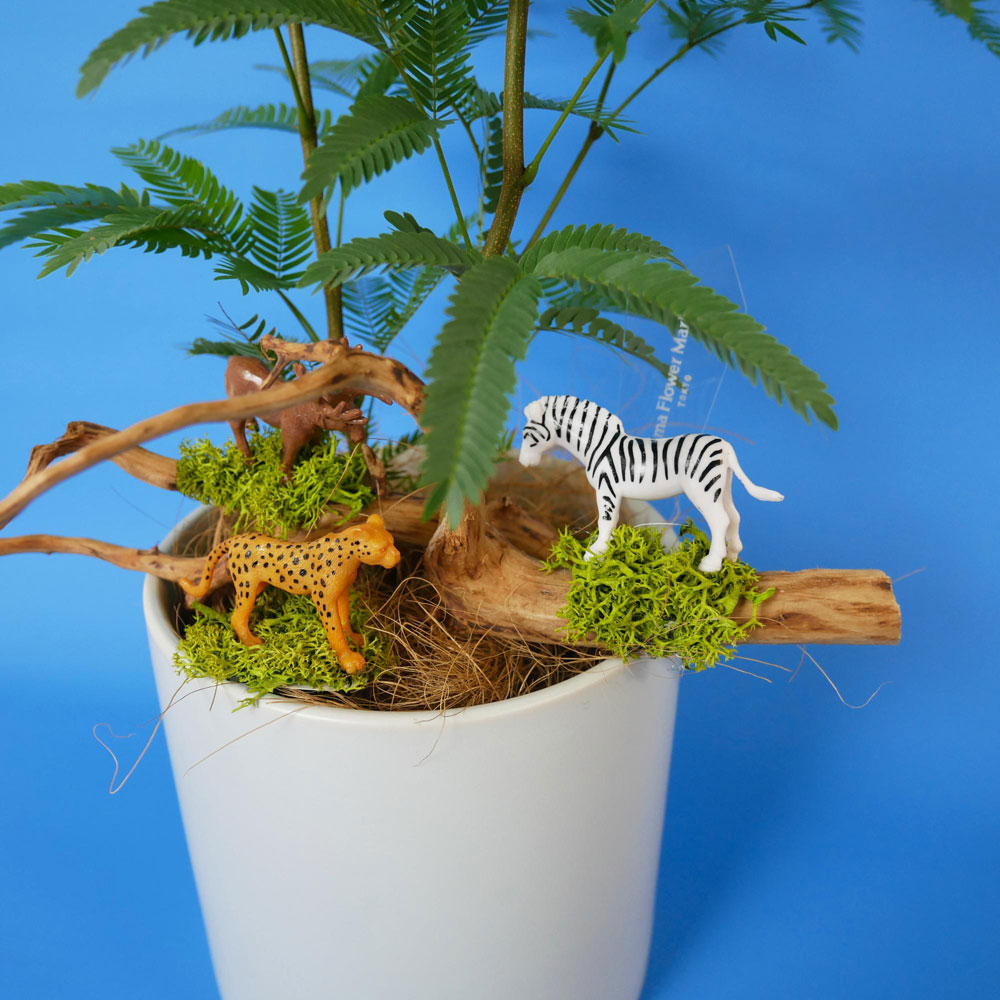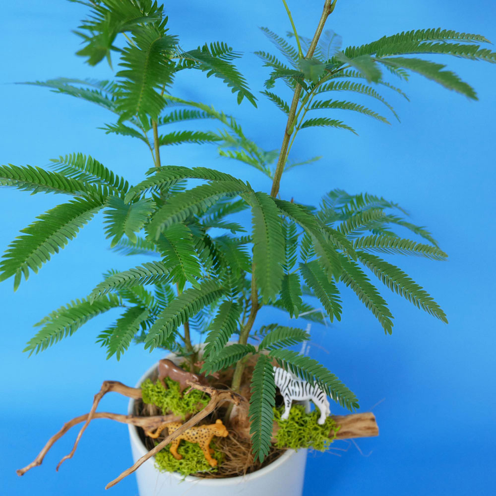 エバーフレッシュは、ブラジルやエクアドル、中南米を主な原産国とするマメ科、コヨバ属の常緑樹です。細く涼しげな葉とスタイリッシュな幹が特徴の常緑高木で、夜になると葉を閉じて眠る「就眠運動」が魅力の観葉植物です。インテリア性が高く、水やりや日当たり管理もしやすいため、贈りものとしても人気があります。動物のオブジェ付きで、お好きな所に飾ってお楽しみいただけます。