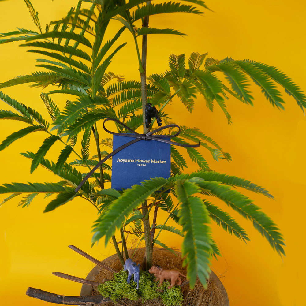 エバーフレッシュは、ブラジルやエクアドル、中南米を主な原産国とするマメ科、コヨバ属の常緑樹です。細く涼しげな葉とスタイリッシュな幹が特徴の常緑高木で、夜になると葉を閉じて眠る「就眠運動」が魅力の観葉植物です。インテリア性が高く、水やりや日当たり管理もしやすいため、贈りものとしても人気があります。動物のオブジェ付きで、お好きな所に飾ってお楽しみいただけます。