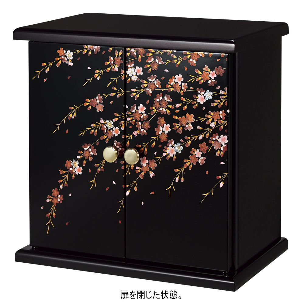 埃が目立ちにくい半艶の紀州塗。黒塗りの扉両面に優美な桜柄をあしらいました。扱いやすい小ぶりなサイズ。