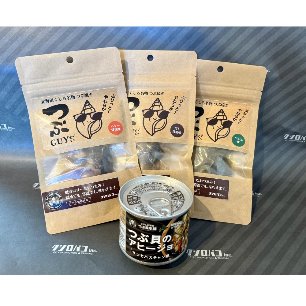 つぶGUY:バター醤油味35g・バジル味35g・だし醤油味2個入り(約30g)、つぶ貝のアヒージョ180g