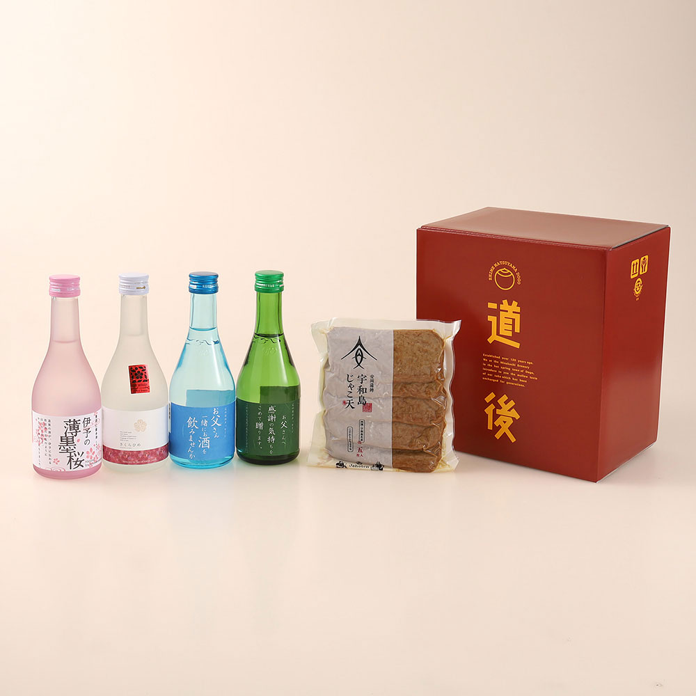 遠く万葉に「熟田津」と謳われた伊予・道後の地。道後をこよなく愛し、この地名にちなんだ清酒「仁喜多津」を造り続けて、一世紀余り。先代から受け継いだ、伝統の技で味わい豊かに醸した「地酒飲みくらべ」と、宇和海で獲れた「ほたるじゃこ」を主原料に、昔ながらに手作業で造りあげた、愛媛名産「宇和島じゃこ天」のオリジナルセットです。