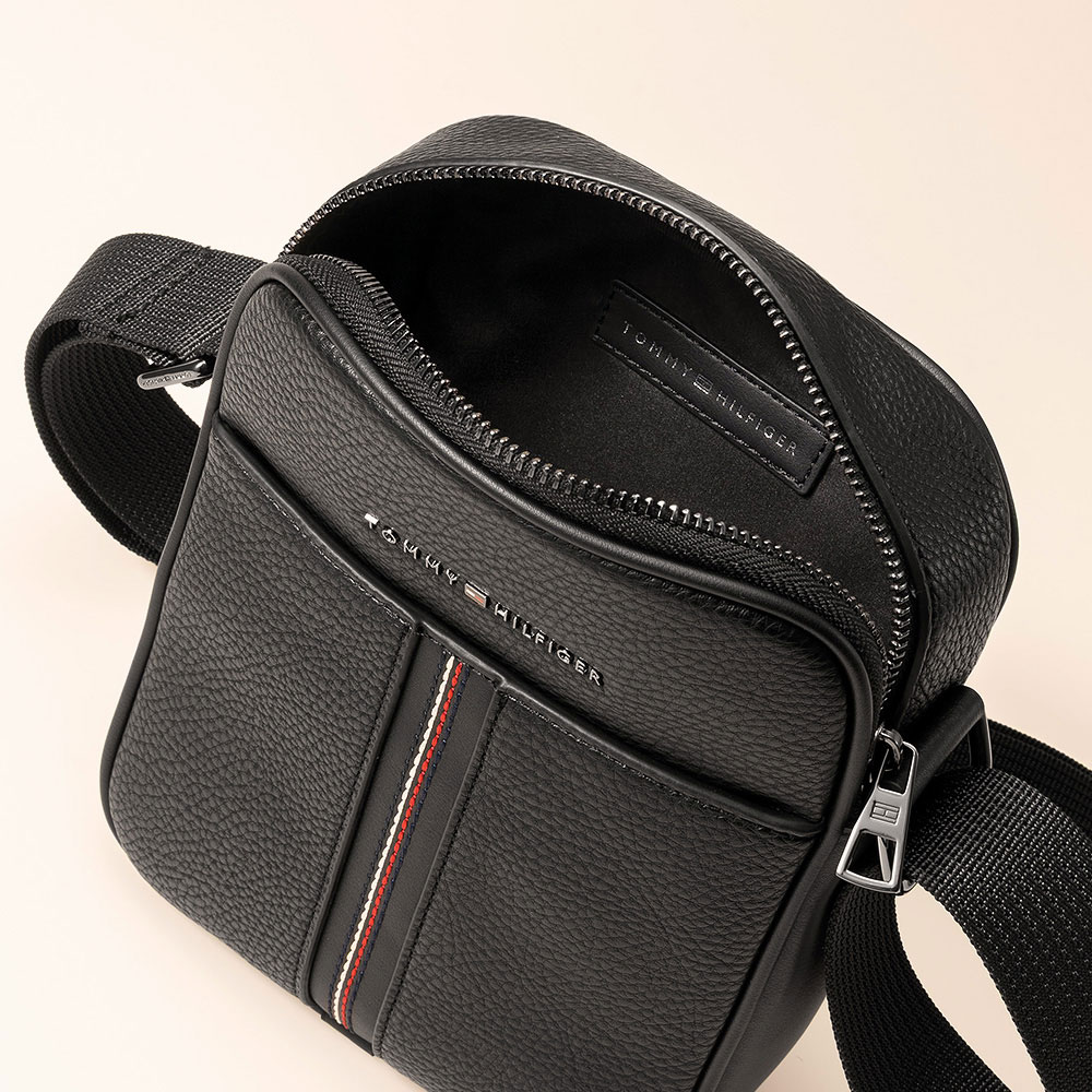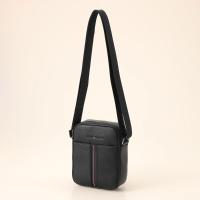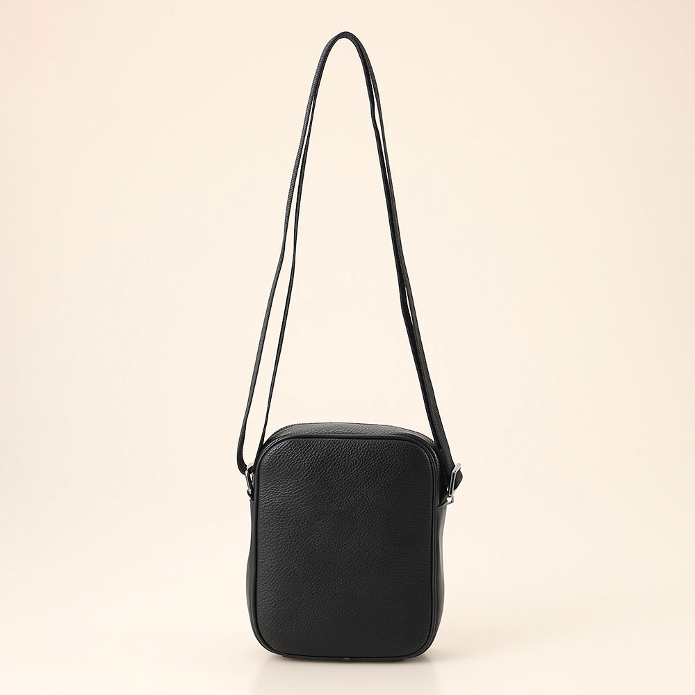 表面にシボのある、しなやかで上質なフェイクレザーを使用したリポーターバッグ。財布やスマートフォンなどの日常の必携品はもちろん、500mlのペットボトルも収まる使いやすい大きさです。縦長フォルムで幅を取らず、持ち運びがしやすいのもポイント。メイン収納部の他に、フロントポケットを設けています。フロントに刻印されたロゴや、フラッグカラーのラインがアクセントです。