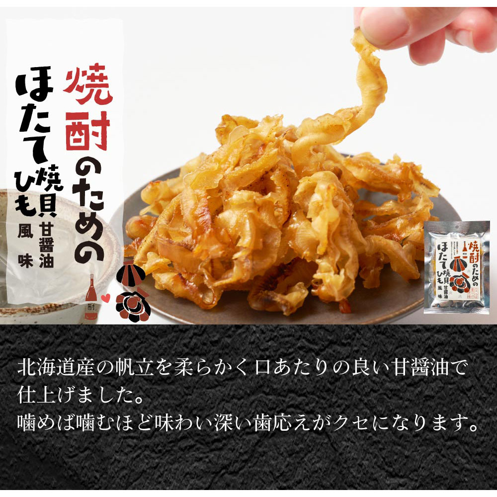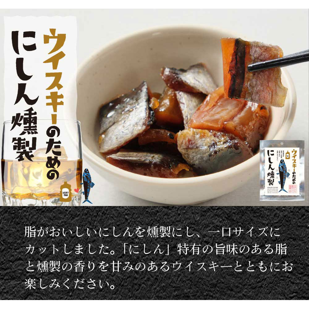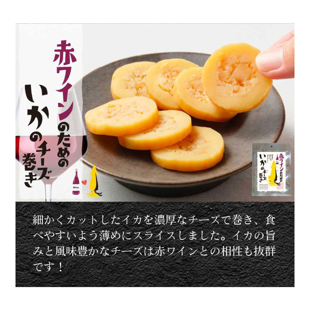 色々なお酒に合う、海産珍味セットです。ビールのためのいかくん波のり短冊や、焼酎のための甘醤油で仕立てたほたて焼貝ひも。白ワインのためのソフトな燻製さきいかや、脂がおいしいウイスキーのためのにしん燻製、細かくカットしたイカを濃厚なチーズで巻いた赤ワインのためのいかのチーズ巻き、日本酒のためのスティックするめの6種セットです。もちろん、その他のお酒と併せてご自分なりのペアリングもお楽しみいただけます。