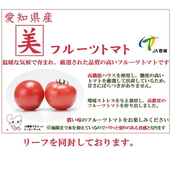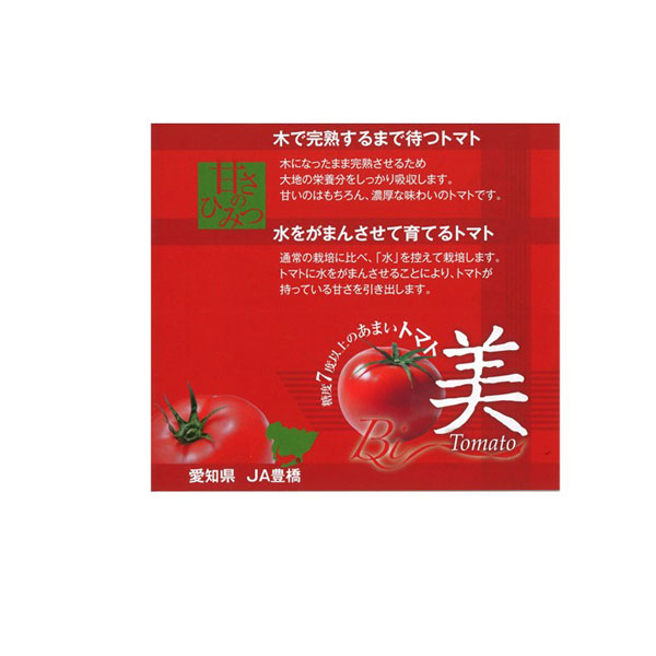 愛知県豊橋で育てられる高糖度トマト「美とまと」。一般的なトマトの糖度が約5度ほどと言われる中、豊橋のブランド基準では糖度8度以上のものだけが「美(び)」と名付けられます。完熟するとまるでフルーツのような甘さが広がり、濃厚で深みのある味わいが特徴です。糖度を高めるために、水分量を抑えてじっくり育てられることで、皮はシャキッとほどよく張り、実はぎゅっと濃縮。ひと口で「甘い」と驚く、贅沢な濃密食感をお楽しみいただけます。また、「美とまと」には抗酸化作用が期待されるリコピンや、肌の健康やストレス対策にも役立つビタミンCが豊富に含まれています。味わいだけでなく、健康面でもうれしいトマトです。サラダ・カプレーゼ・そのまま丸かじりにも最適。甘み、香り、食感の三拍子が揃った、ワンランク上のトマトをぜひご家庭でどうぞ。