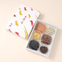 いかの塩辛80g、わさび漬け100g、味付数の子45g、松前漬80g、山椒細切昆布80g、土佐煮60g